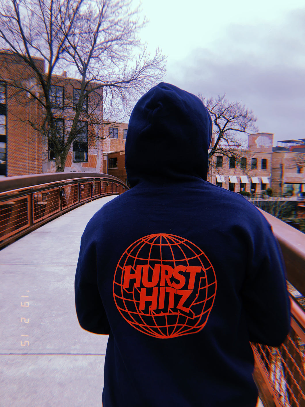 Hurst Hitz Navy Hoodie with red lettering, presenting for the first time the "Hurst Hitz World" logo on the back of the hoodie. The mantra: Progression, Direction, Happiness, Wealth, Balance on the left sleeve.